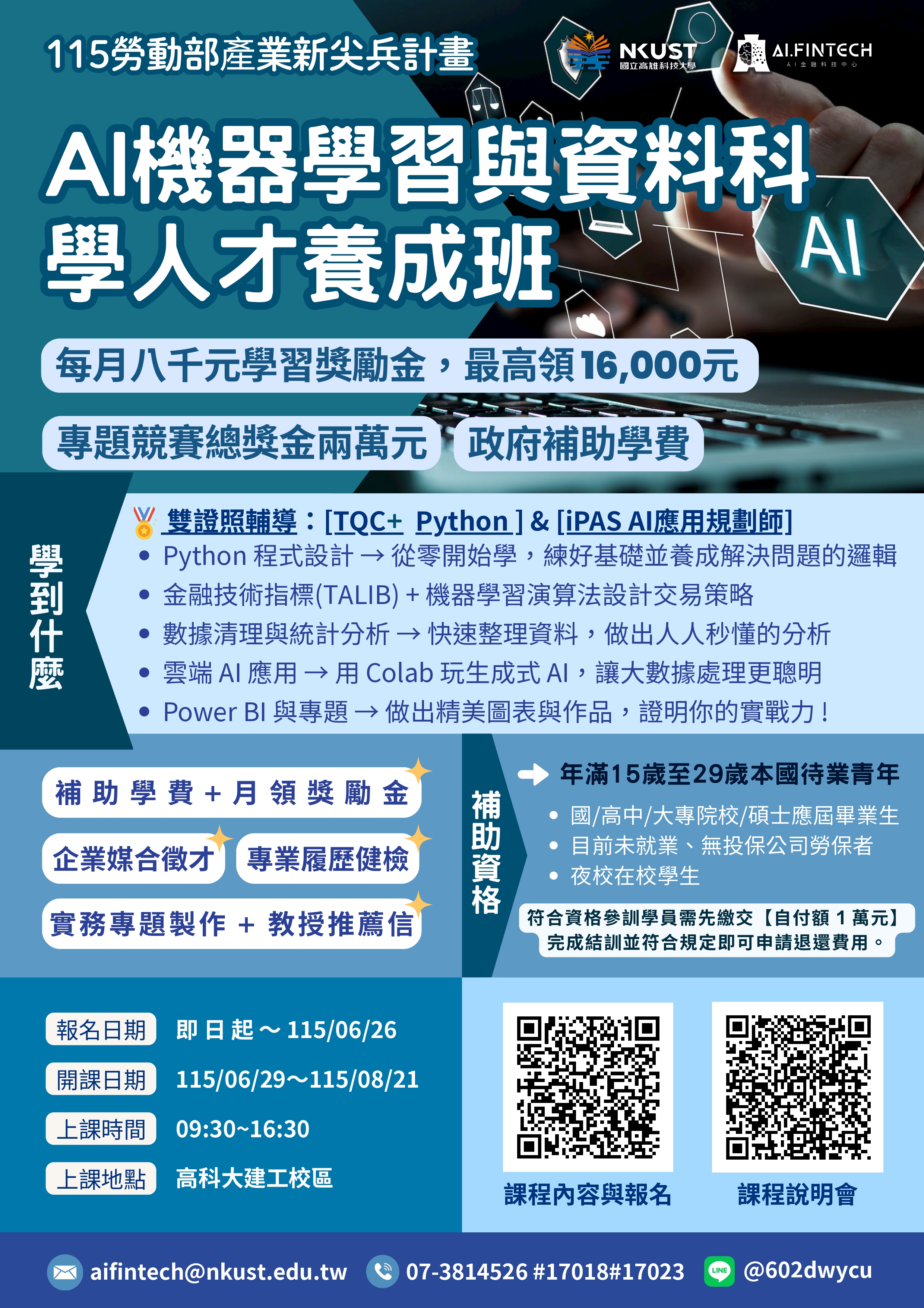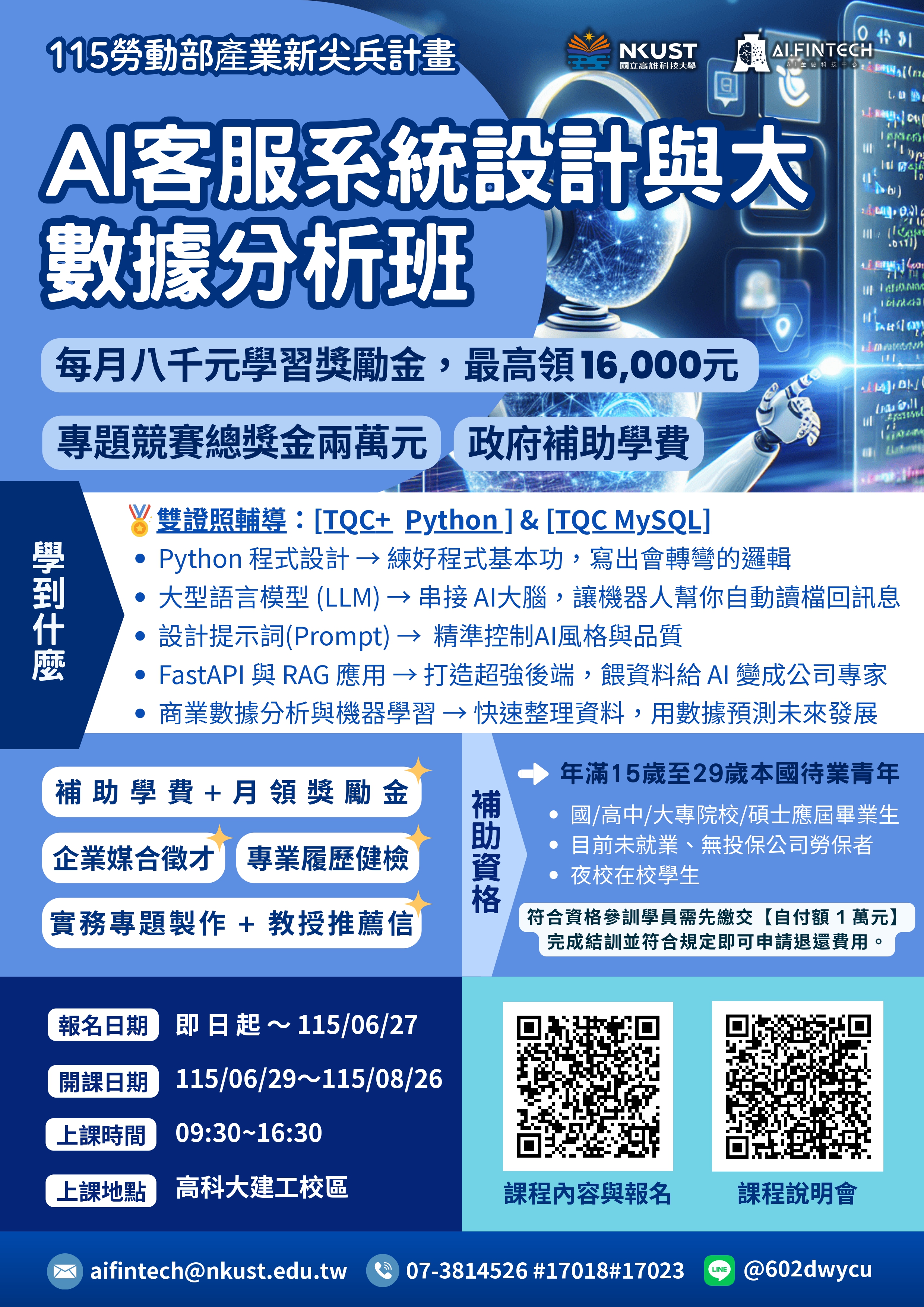 六、課程及報名相關請洽國立高雄科技大學(燕巢校區) AI金融科技中心洪先生,電話:07-3814526#17018,aifintech@nkust.edu.tw
