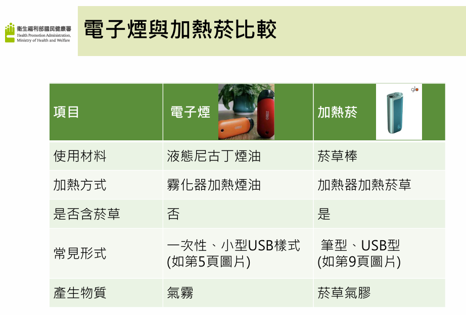 近期,因電子菸及加熱菸使用者日增造成潛藏因子及事件問題層出不窮。為提高大家辨識,國民健康署製作相關資料,供大家辨識。校園中若有發現攜帶或使用電子菸者,除提供資料請衛生局開罰,也將進行相關通報。詳細內容請參與附件。