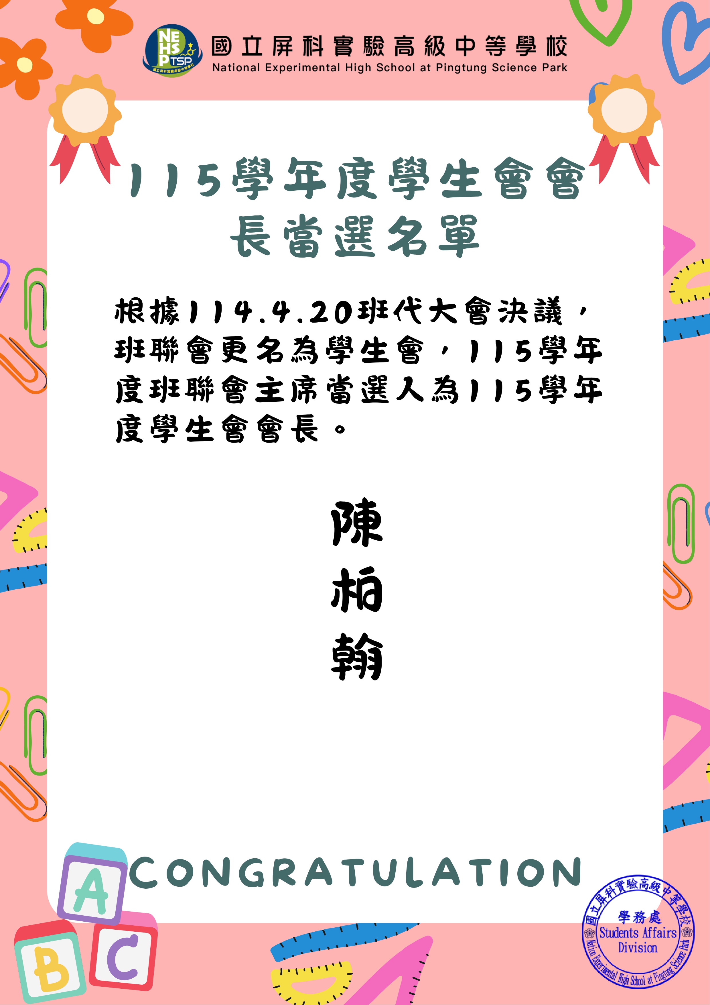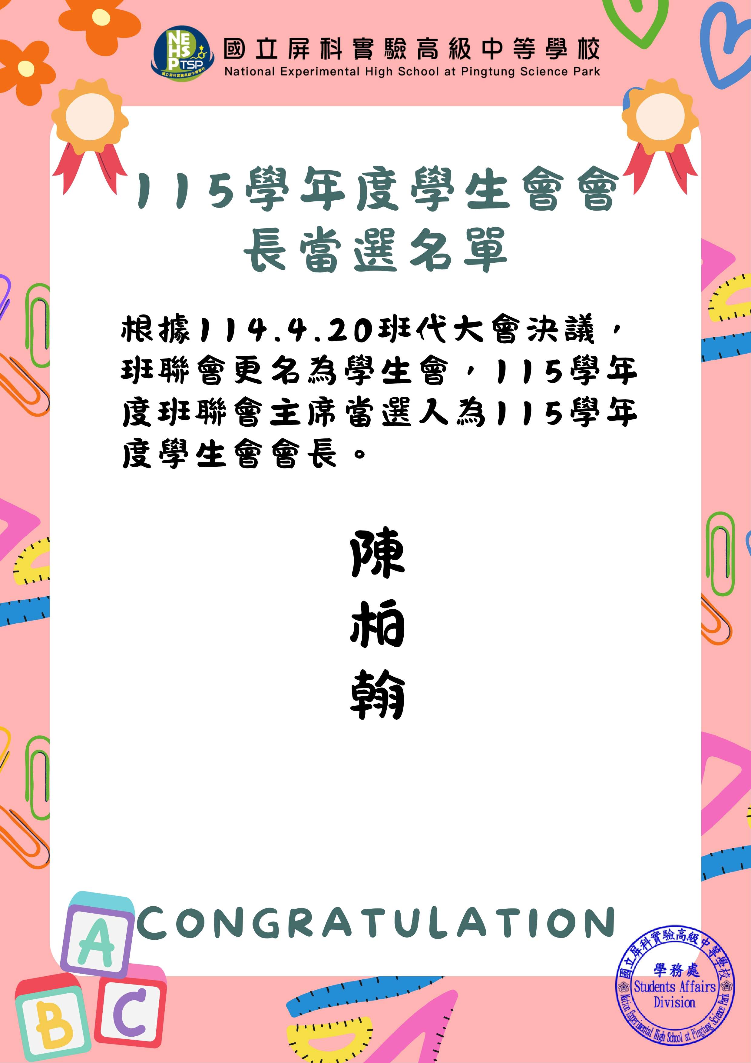 根據114.4.20班代大會決議,班聯會更名為學生會,115學年度班聯會主席當選人為115學年度學生會會長。