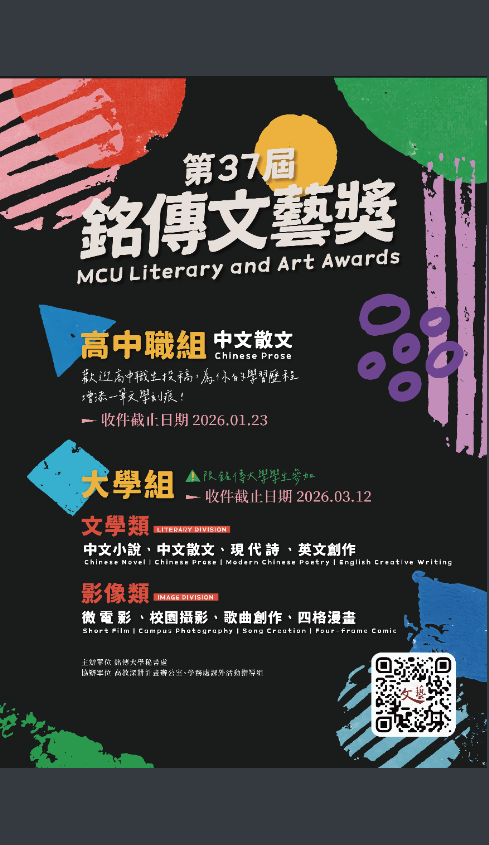 一、為提倡寫作風氣,提昇學生文學創作素養,培育文藝人才,本校由秘書處主辦「第37屆銘傳文藝獎」,並設立高中職中文散文組。