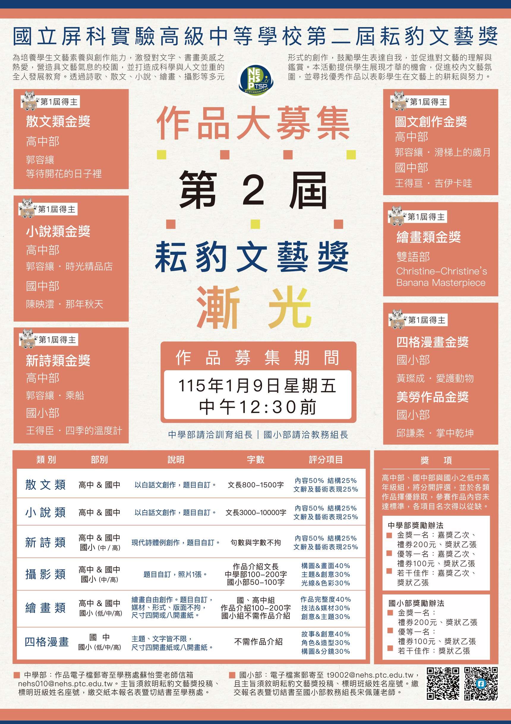 三、收件與截稿日期:即日起至115年1月9日(五)中午12:30截止,逾時將不予收件。