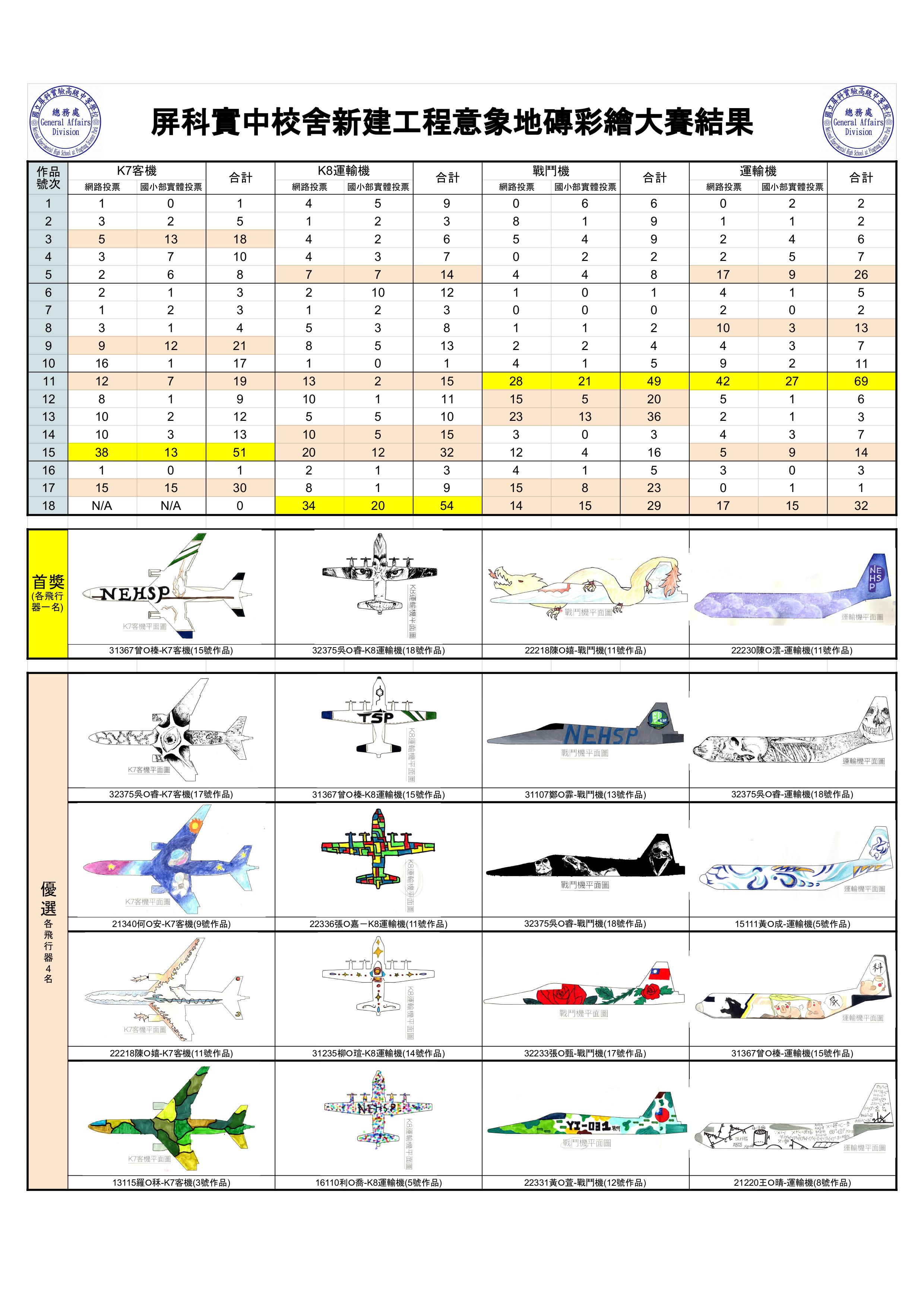 屏科實中校舍新建工程地景彩繪大賽歷經教職員工生票選,首獎四架飛行器作品將交由營造商施作,如配合現場施作需作必要之調整,將會同作者及指導教師一同與營造商討論。