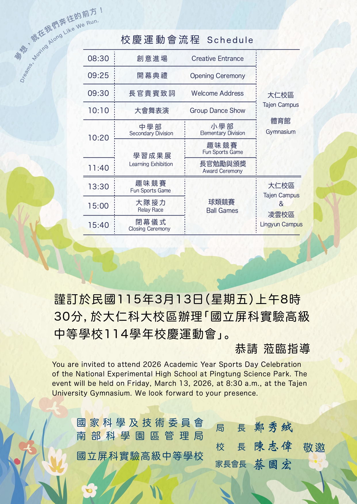 誠摯歡迎各位嘉賓與家長的蒞臨,流程及停車資訊如附件,請參閱。