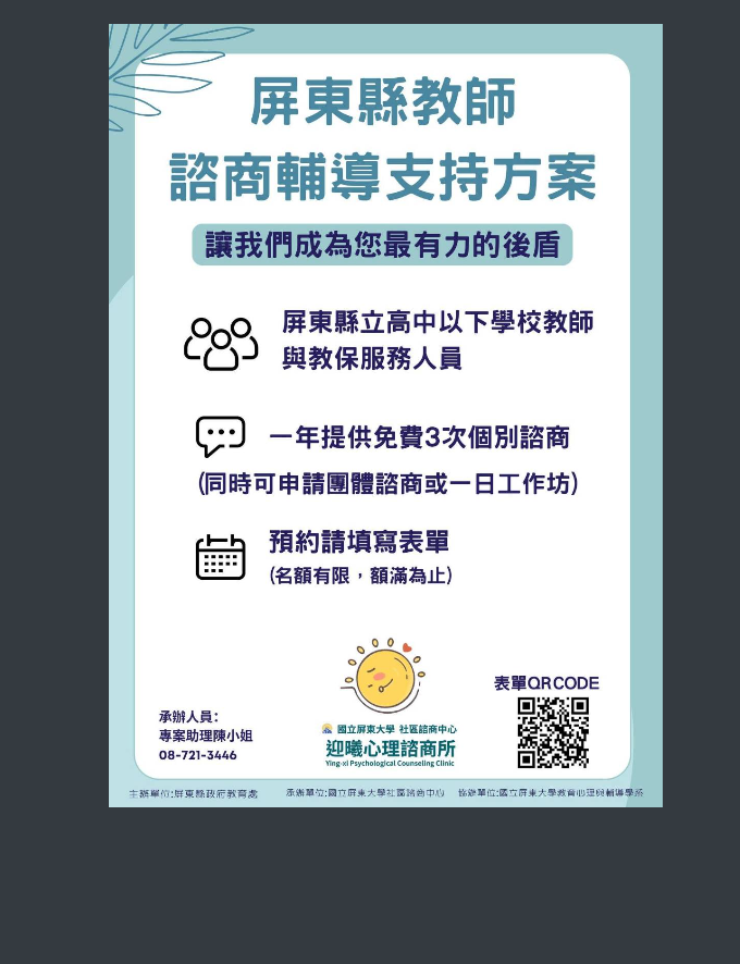 六、如有相關疑問,請逕洽國立屏東大學教師支持方案專用信箱(teachercoun.pt@gmail.com)詢問,或致電專案助理陳小姐(08)721-3446 。