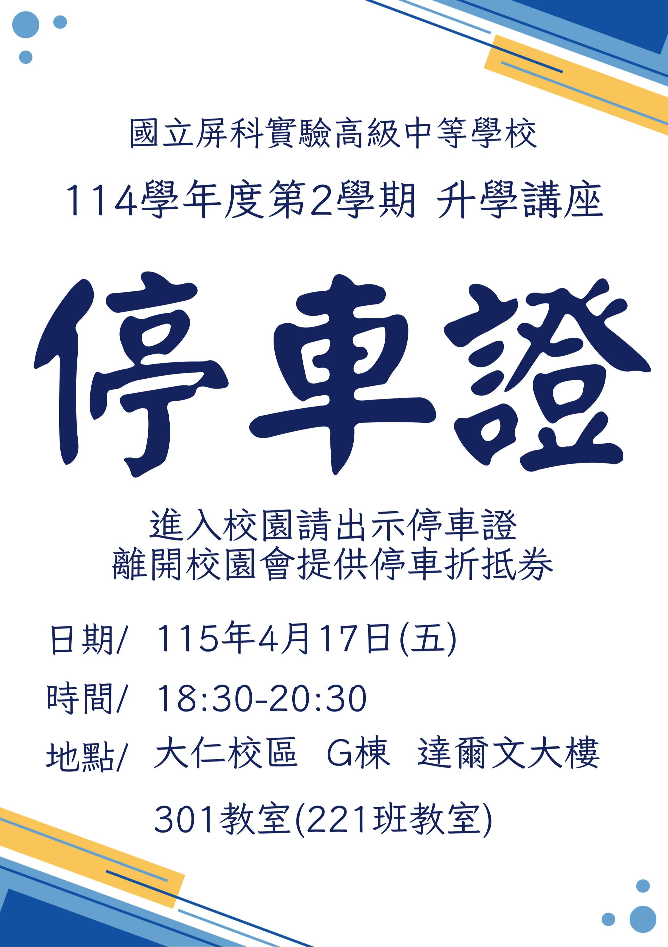 🚗 入校請出示停車證,離校時將提供停車折抵券。