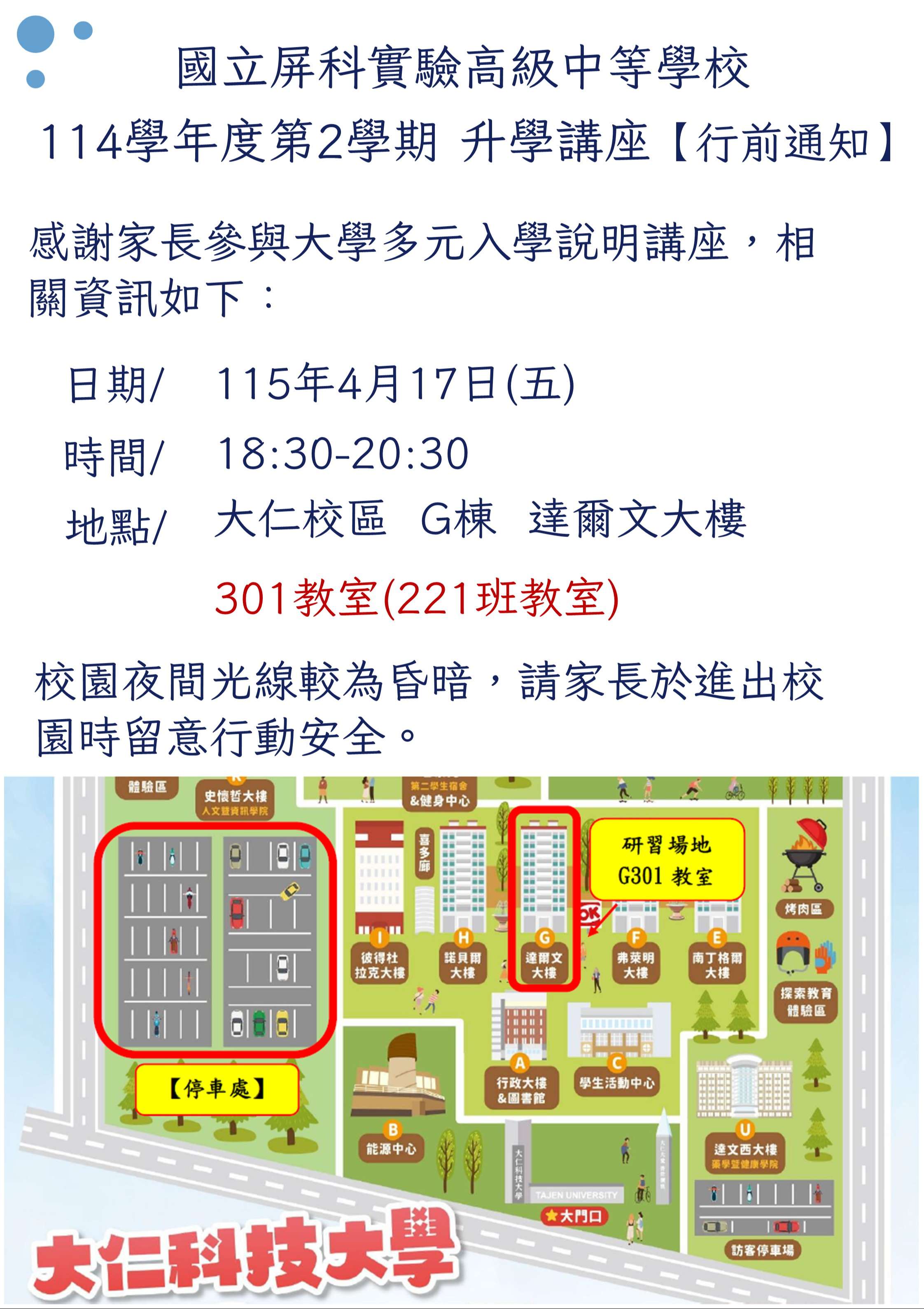本校大學多元入學說明講座,請報名參與的家長留意以下資訊: