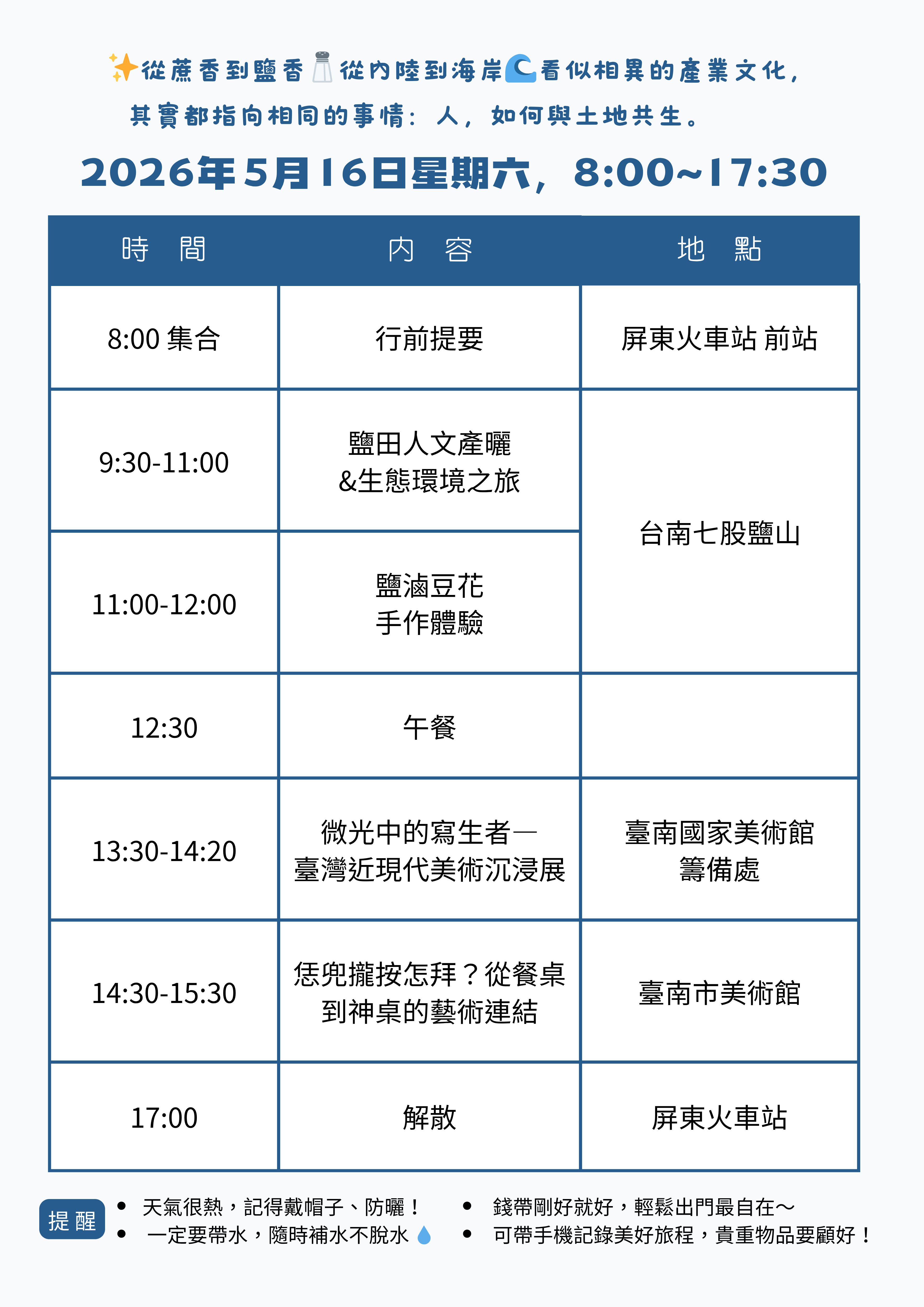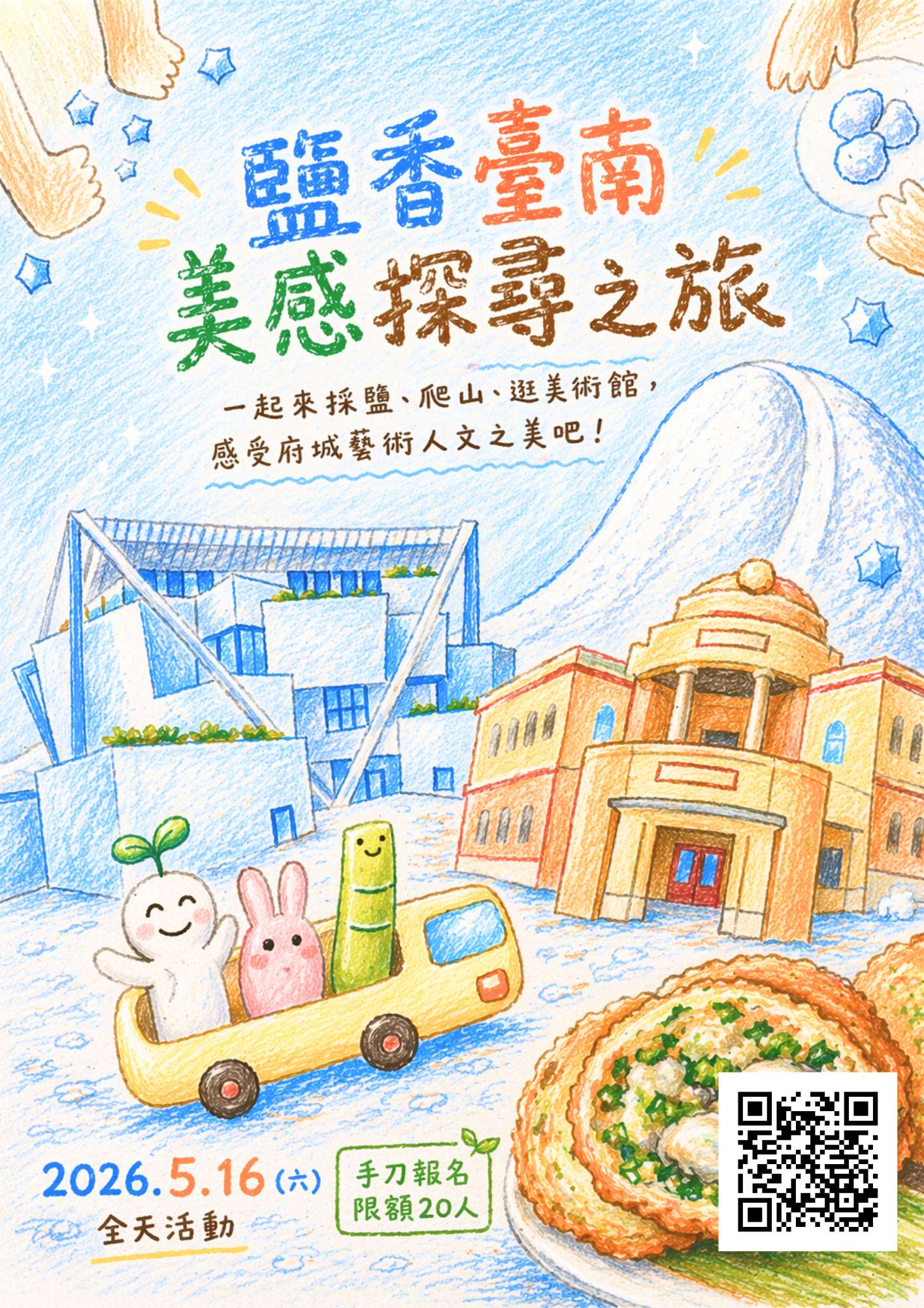 本活動名額有限,敬請把握機會踴躍報名參加,一同走進鹽的世界,感受臺南獨特的人文與美感風景。