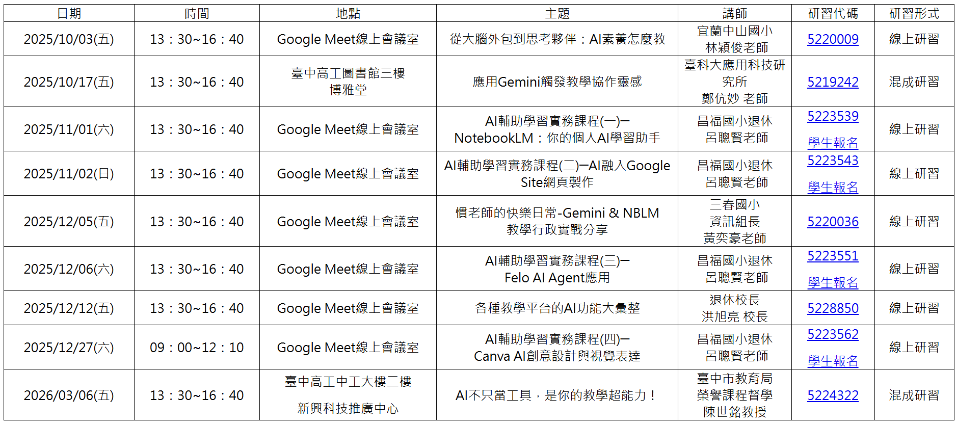 各研習場次與詳細課程內容請參閱下表,報名網址請點擊下方連結: 新興科技教育聯盟中心學校114學年度舉辦新興科技生成式AI主題系列研習活動