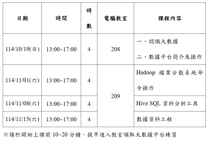為培訓學生具備大數據實務能力並參加相關競賽,特辦理培訓課程,歡迎踴躍報名!