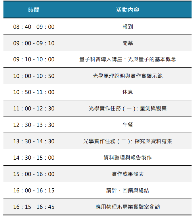 這是一場為高中生設計的一日科學體驗活動,引導高中學生走入量子科學的入門世 界,透過淺顯易懂的量子概念講解與光學探究實作,使學生能以直觀方式理解光與物 質行為背後的量子原理。活動內容結合理論、示範與小組實作,包含光學量測、資料 整理與成果分享,讓學生在一日之中體驗科學探究的完整流程。透過親自操作與團隊 合作,不僅加深對光與量子的理解,也能培養科學觀察、問題分析與表達能力。適合 所有對物理、科技或科學探索充滿興趣的高中生參與。