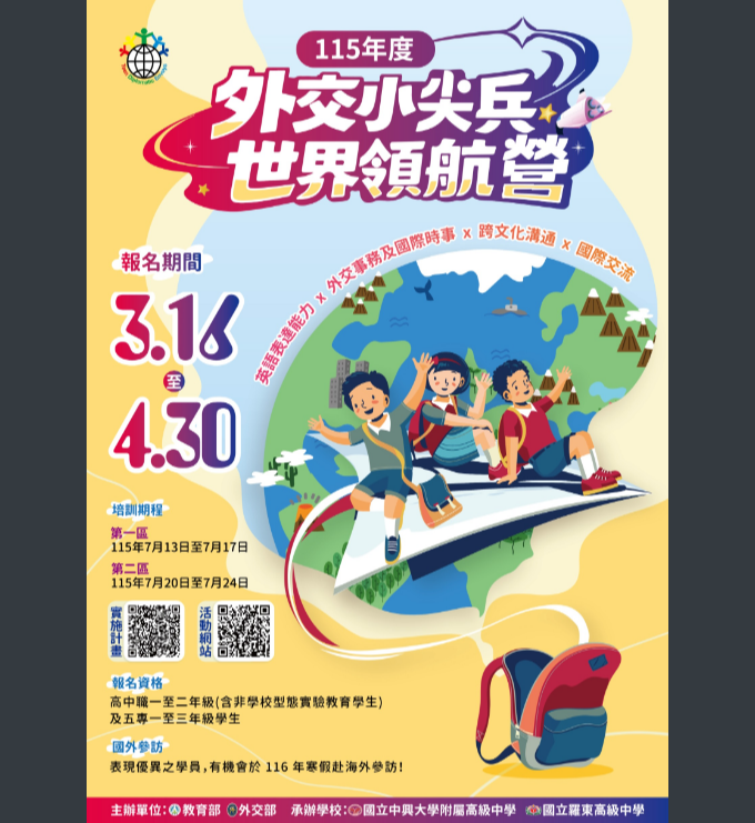 2、原則請依就讀學校所在縣市分區報名,各區預計錄取84人,並各擇優遴選10人於116年寒假赴國外參訪。