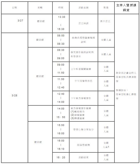 十一、營隊特色:本活動結合IYPT題目作為探究實作主題,可提供學生體驗探究實作歷程,並以生活上常見的物理現象與事物設計種科普闖關結合力學、光學、聲學、電學、磁學、電磁波、能量轉換及流體力學等類別,藉由團體合作競賽與闖關方式實施,由學生動手做親自體會以瞭解其中的科學原理與概念。