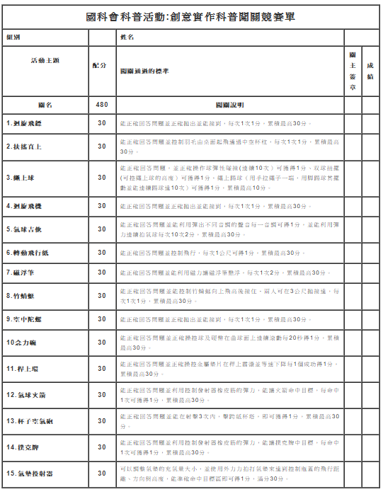 (一)志工:高中學生報名,區分為15關,每關3位志工組成,擔任科普闖關解說關。