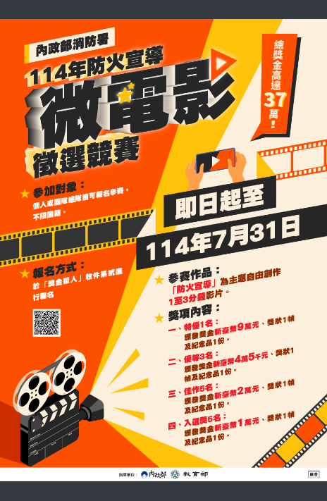 內政部消防署「114年防火宣導微電影徵選競賽活動辦法」及「徵件圖卡」等資訊