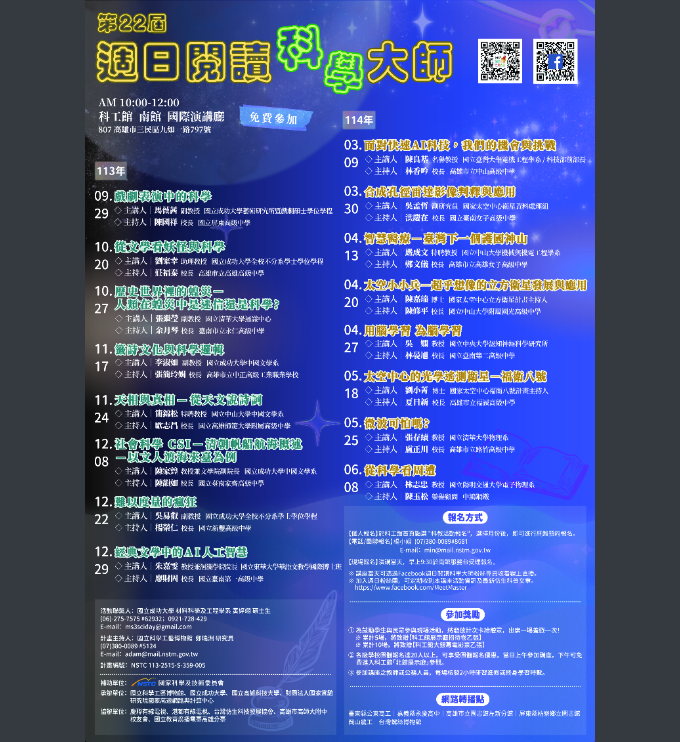 第22屆週日閱讀科學大師系列科普講座活動資訊,請詳附件。