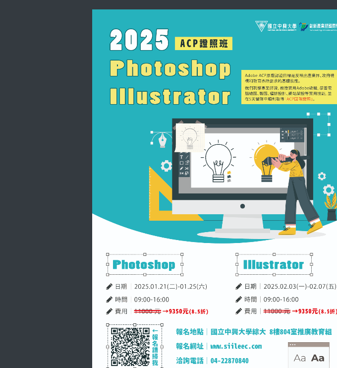 (一)對想學習電腦繪圖、製圖、編排設計、網站架設等實用技巧,規劃《Adobe軟體ACP證照輔導》5日營,分別策畫Photoshop、Illustrator軟體,協助學生順利取得產業界、政府機構和教育界所認可ACP國際證照。