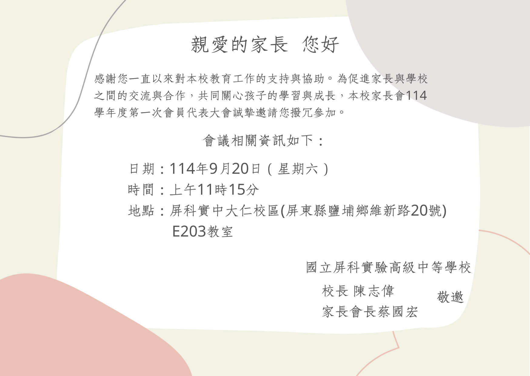 有關本校家長會114學年度第1次會員代表大會相關會議資訊及動線請參閱附件資料。