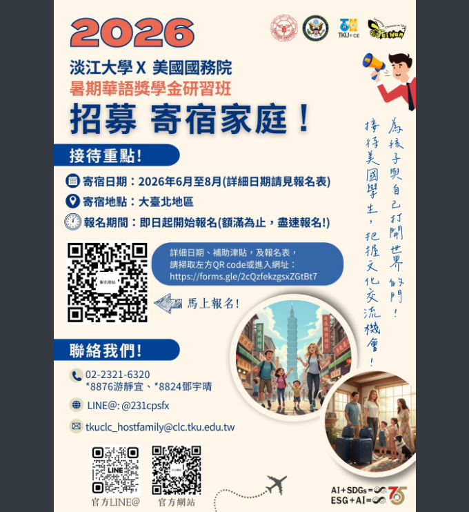 六、聯絡人:游靜宜、鄧宇晴;電話:(02)2321-6320轉8876、8824;電子信箱:tkuclc_hostfamily@clc.tku.edu.tw。