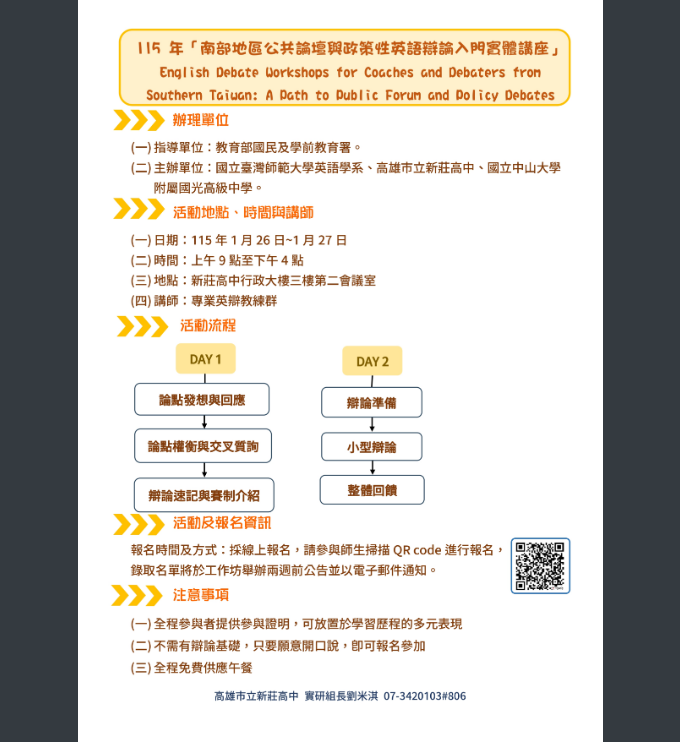 (三)內容:無論是公共論壇或政策性英辯工作坊,講師將以115年「全國高中英語辯論比賽」之辯題為例,帶領學員認識與該辯題相關之論點與策略,學員實作練習內容亦將與比賽辯題有關。