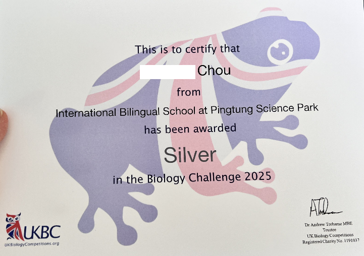 Congratulations! Our Bilingual Department student Chou has won the British Biology Challenge - Silver Award!