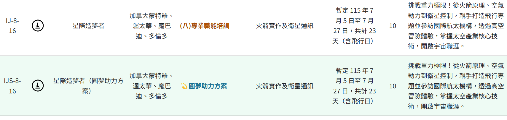 本校申請案號https://twpathfinder.org/overview1517、IJS-8-16(圓夢助力方案)、IJ-8-16(一般方案)。案號名稱:星際造夢者(圓夢助力方案)、星際造夢者,主題為太空航太科技,出訪地區為加拿大蒙特羅、渥太華、多倫多等城市,暫定115/07/05-07/27日辦理。若經錄取,費用由青年部專案經費支應。